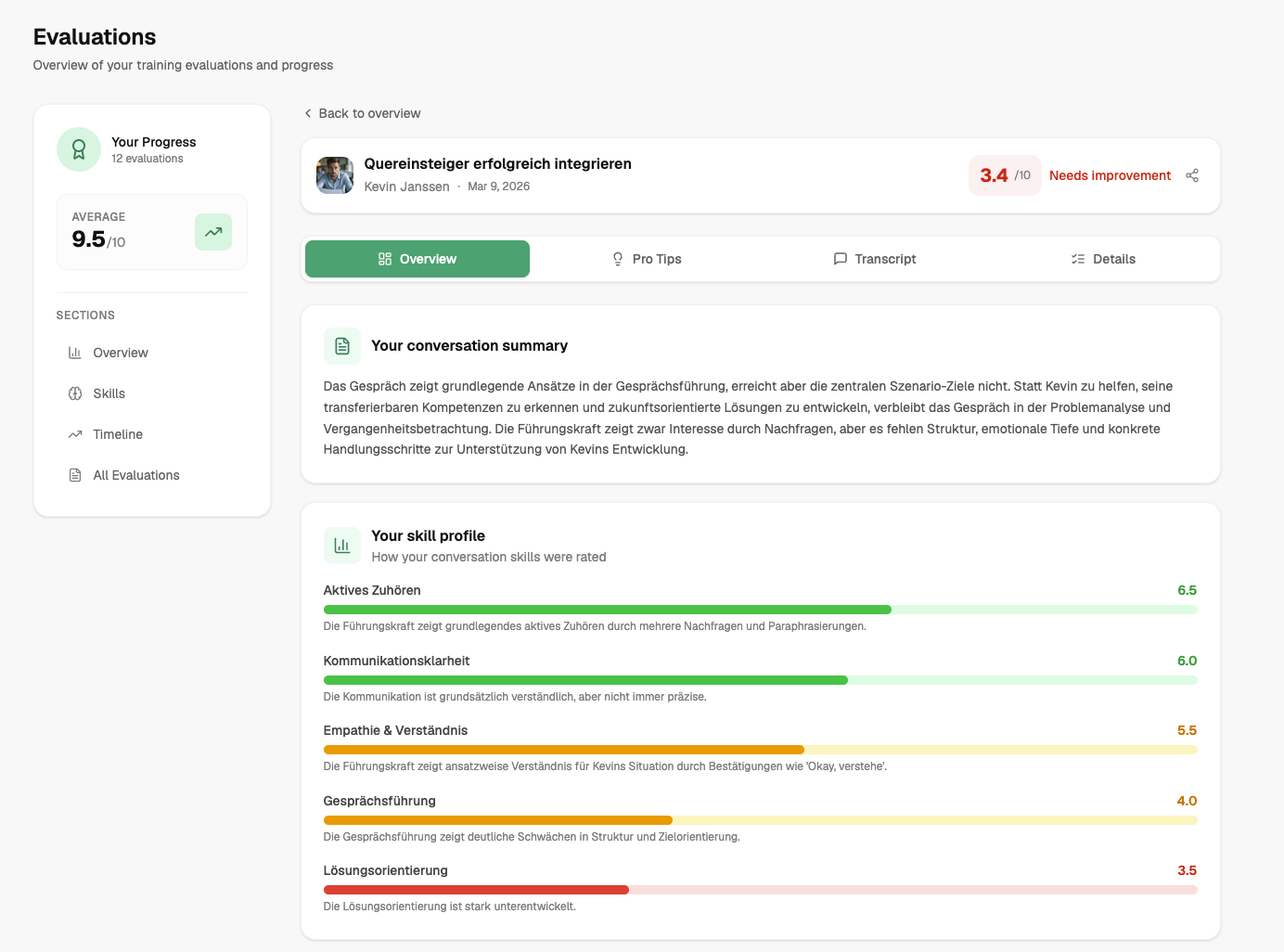 Every employee is different – and reacts differently to feedback. Our characters are built on scientifically validated personality models and simulate realistic conversation dynamics: from the insecure junior employee to the critical senior developer.