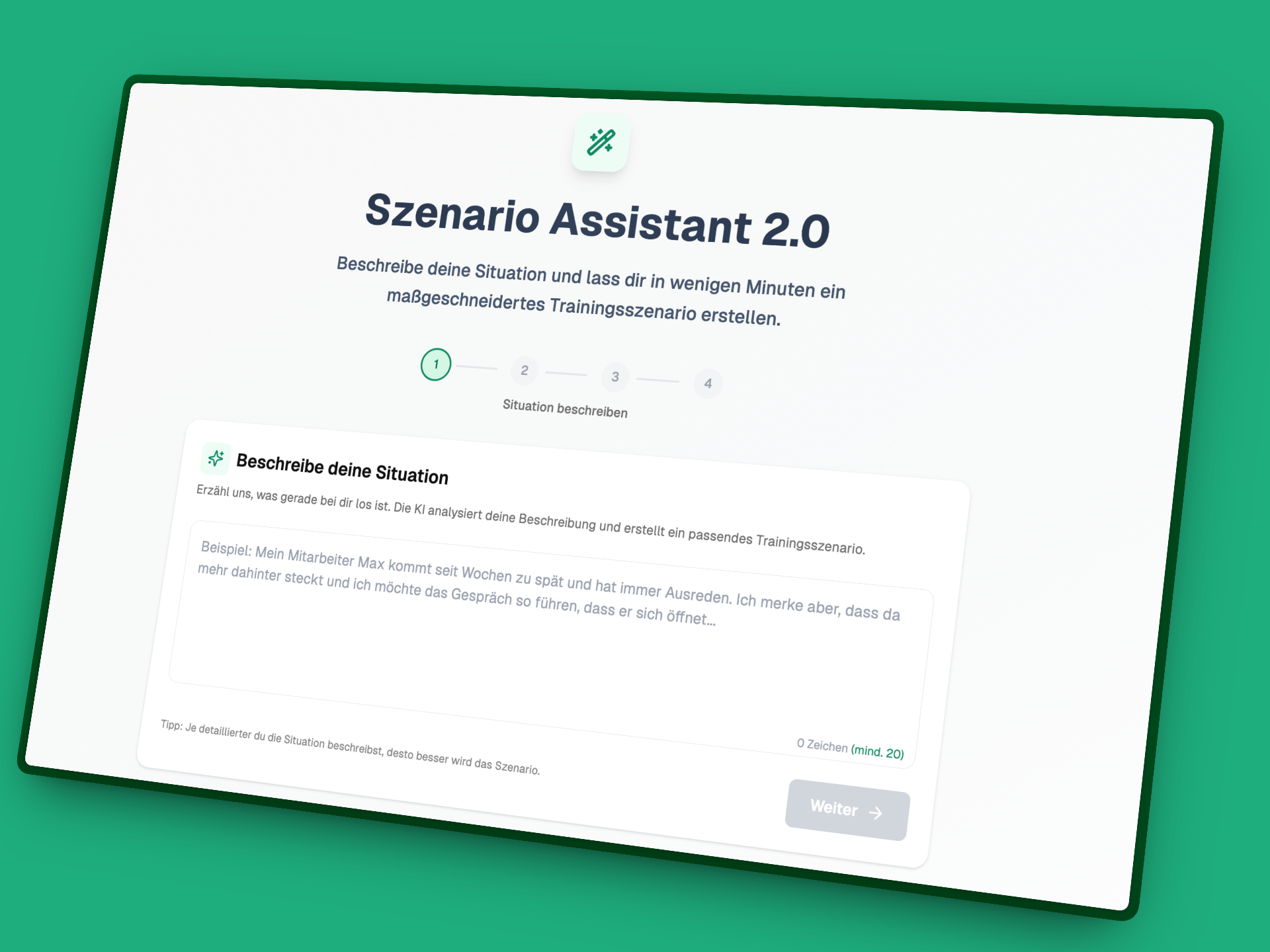 Der Einstieg ist denkbar einfach: Du beschreibst in Freitext die Gesprächssituation, die du trainieren möchtest. Etwa: Ich muss mit einem Teammitglied sprechen, das seit Wochen unmotiviert wirkt und Deadlines verpasst. Die KI analysiert deine Eingabe und extrahiert automatisch alle relevanten Elemente - Charakterprofil, Kontext, emotionalen Ton und Schwierigkeitsgrad.