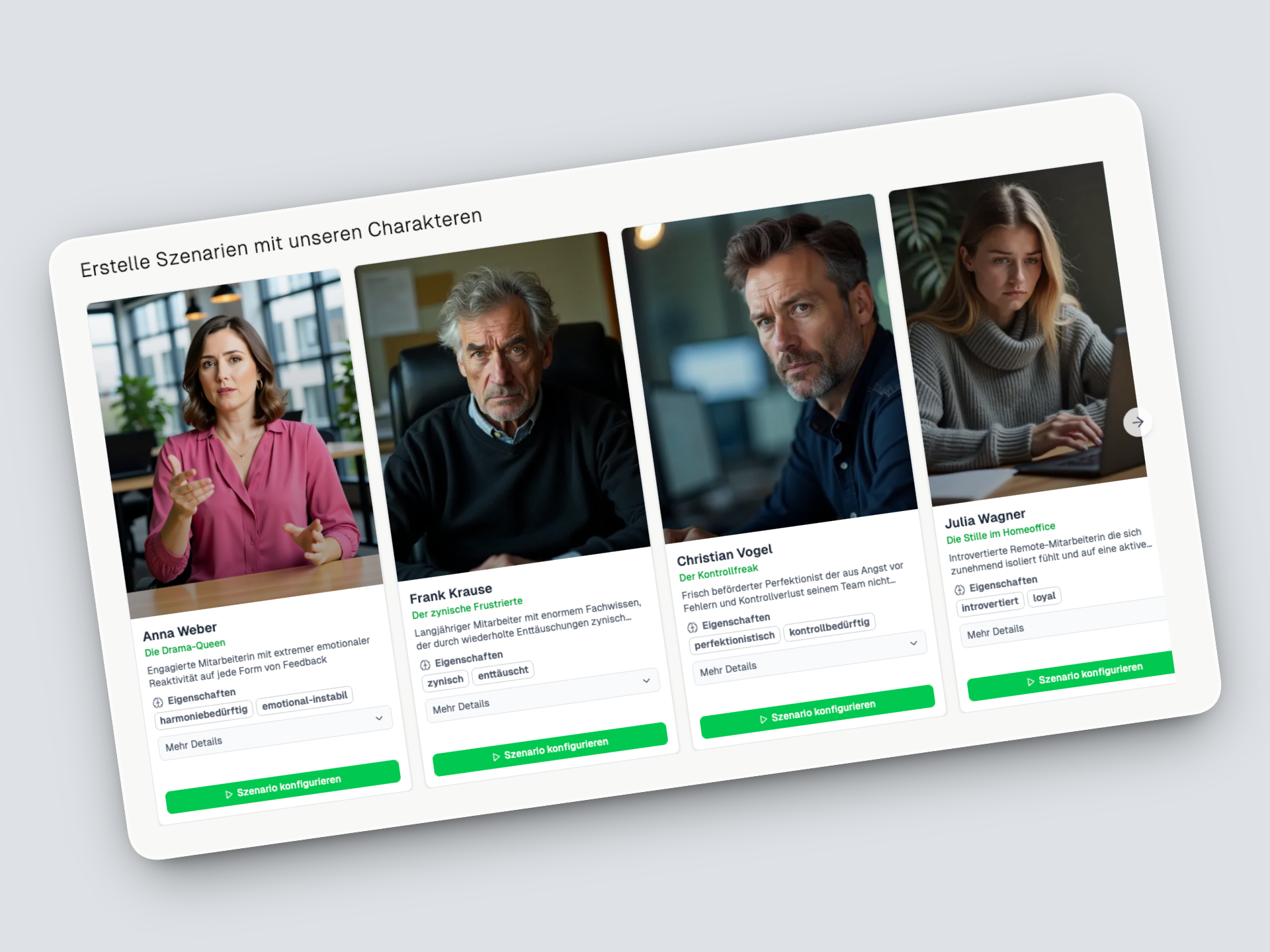 Eure Führungskräfte trainieren mit wissenschaftlich fundierten KI-Charakteren – von der unsicheren Nachwuchskraft bis zum kritischen Senior-Mitarbeiter. Jeder Charakter basiert auf dem Myers-Briggs-Modell und simuliert realistische Gesprächsdynamiken.