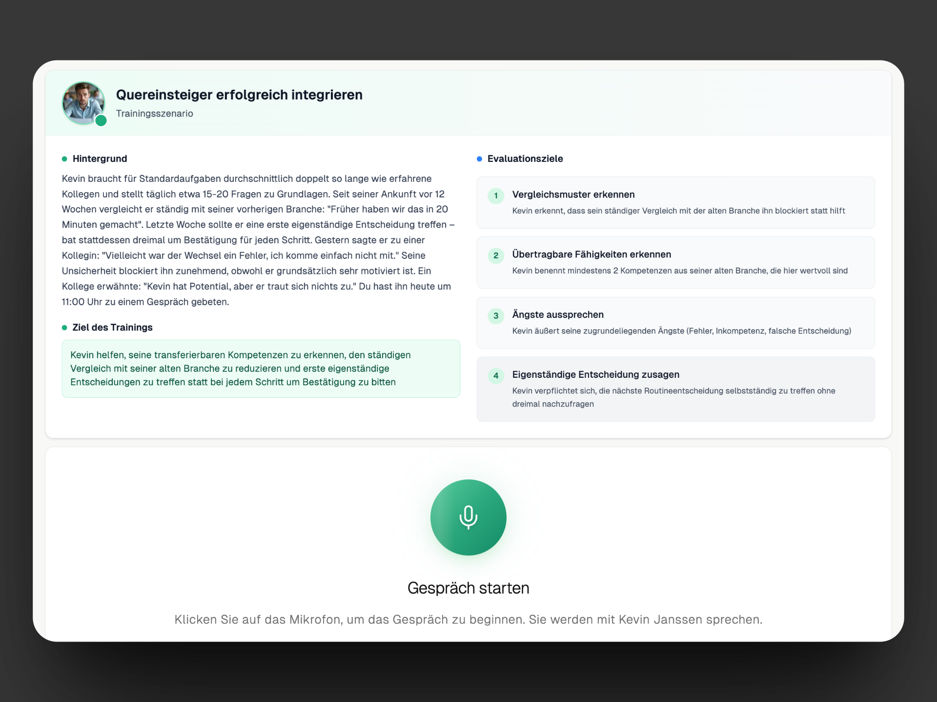 Übe mit introvertierten, extrovertierten, defensiven oder emotionalen Charakteren – so wie deine echten Mitarbeiter.→ Keine Überraschung im echten Gespräch